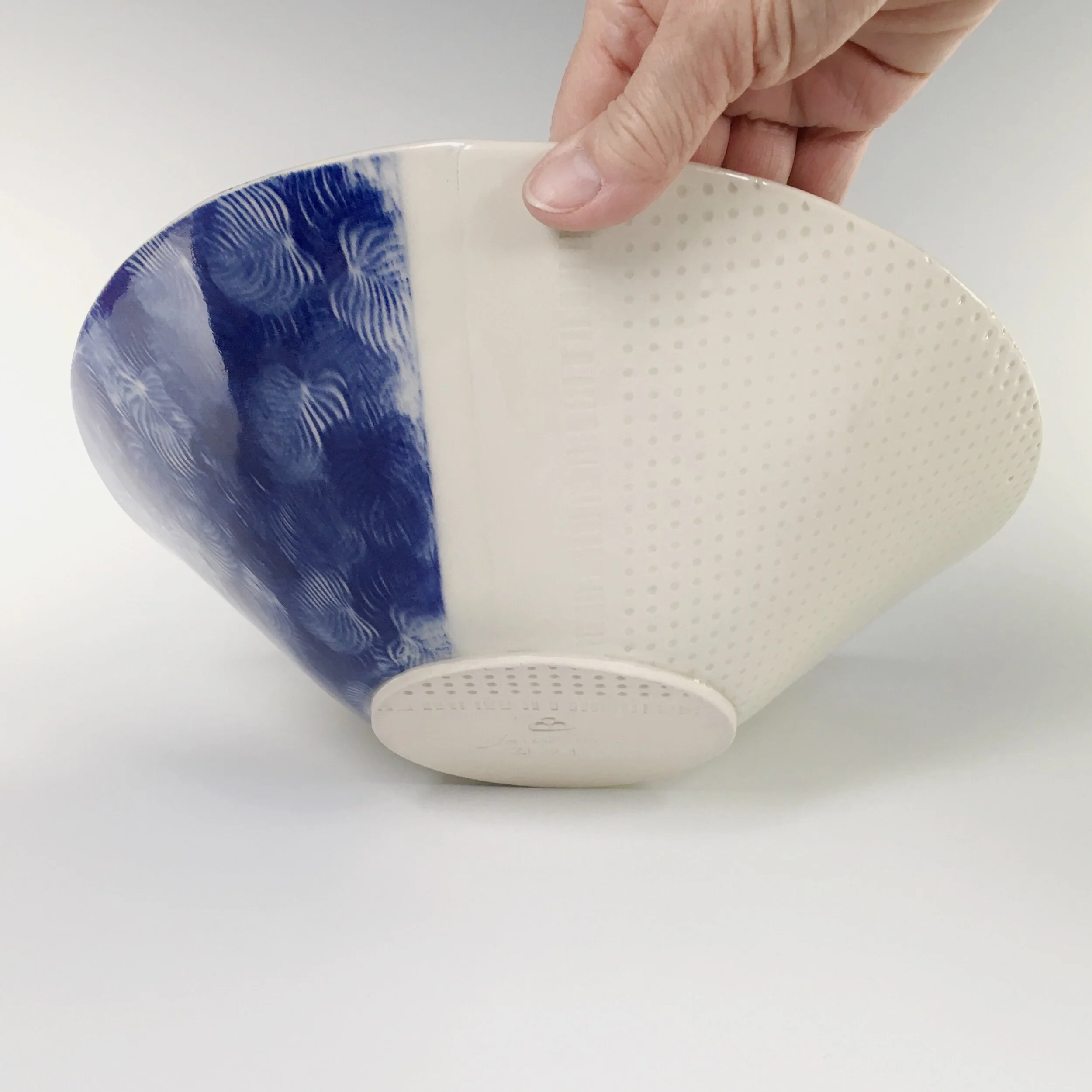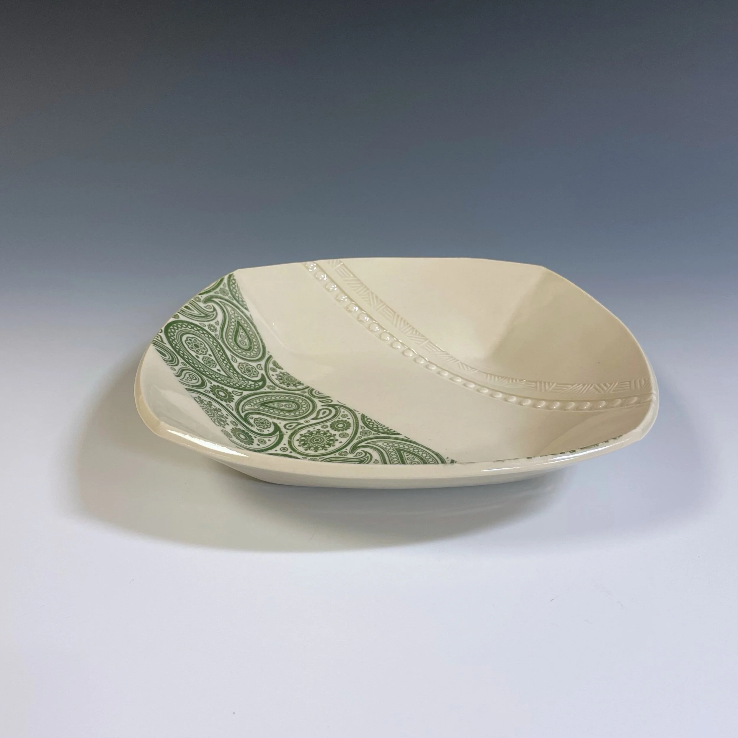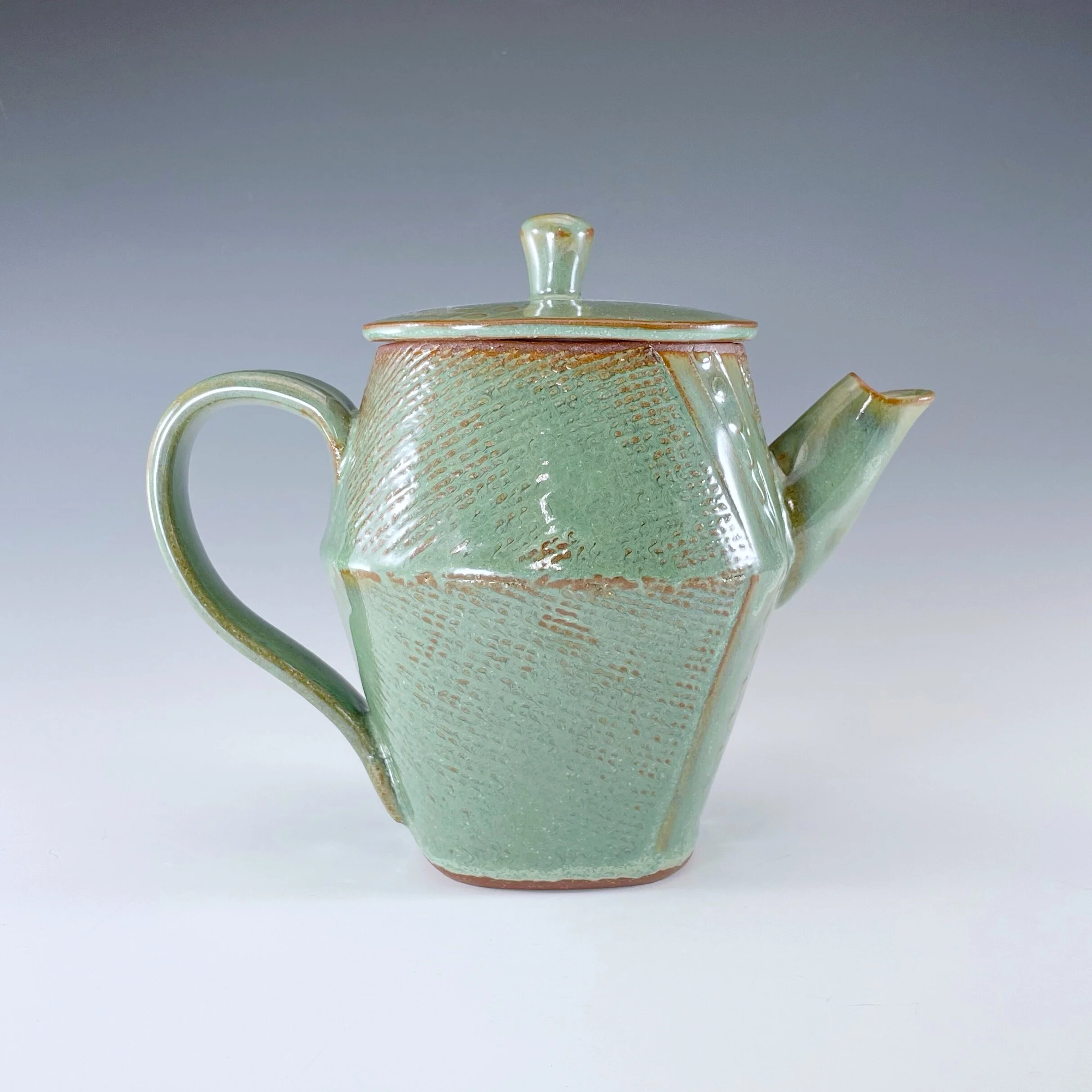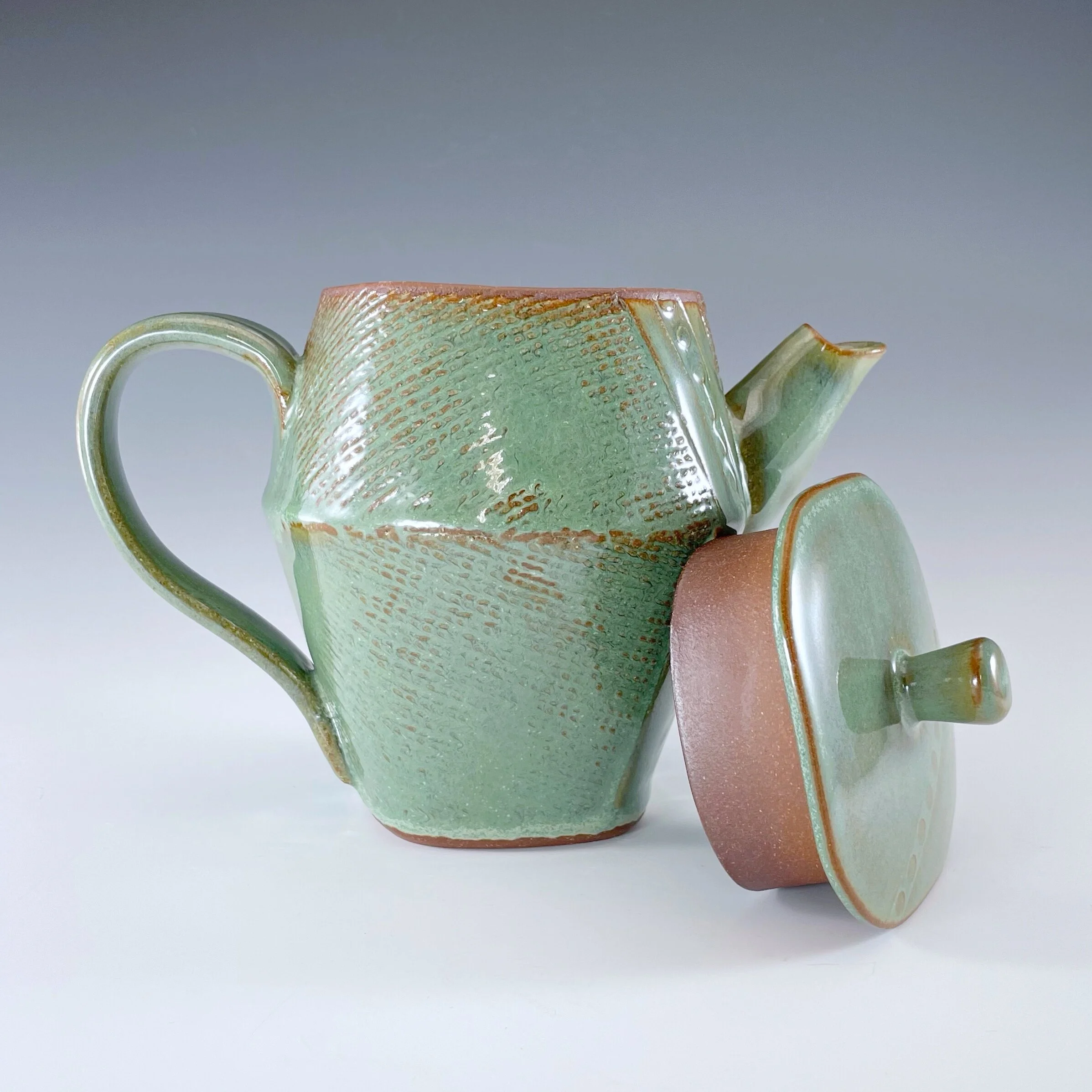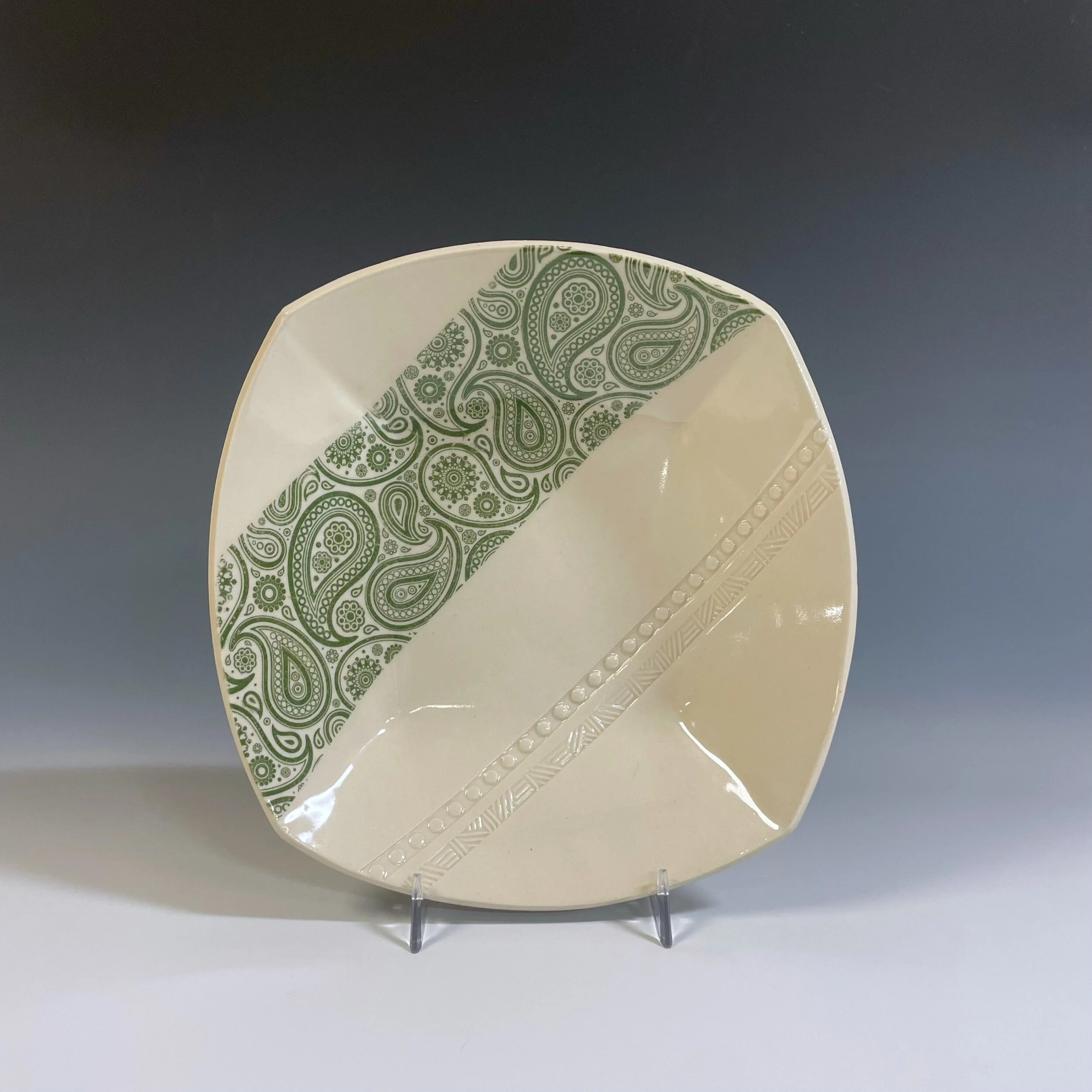 All my work is made from slabs and without a potter’s wheel. Look closely and you will be able to see the place where the seams come together. It is fired twice in an electric kiln, the second firing going up to 2200 degrees Fahrenheit. The clay and glazes are lead-free and food safe. All my work is made for use, not just to be displayed. It is durable, microwaveable, and dishwasher safe.