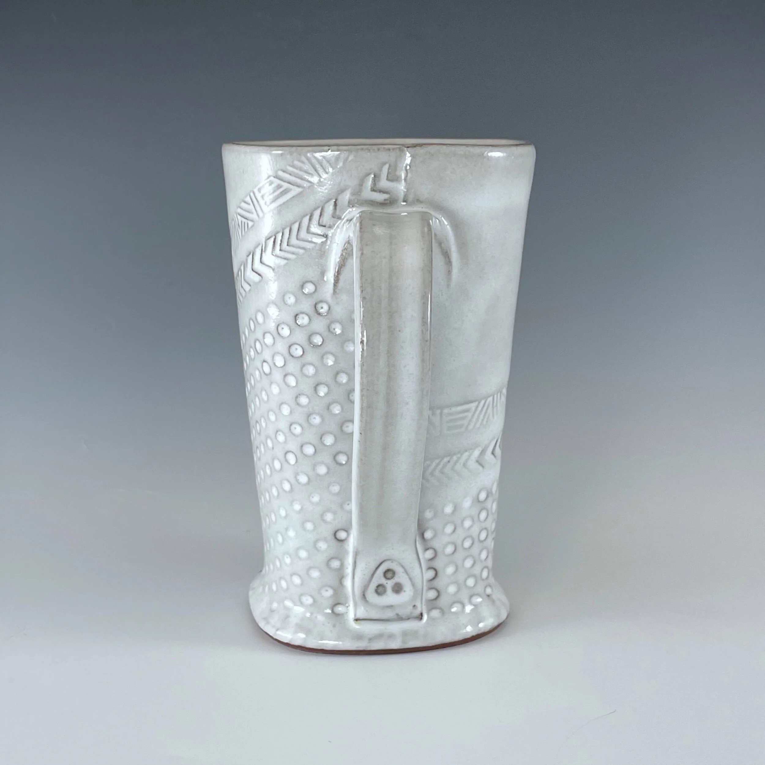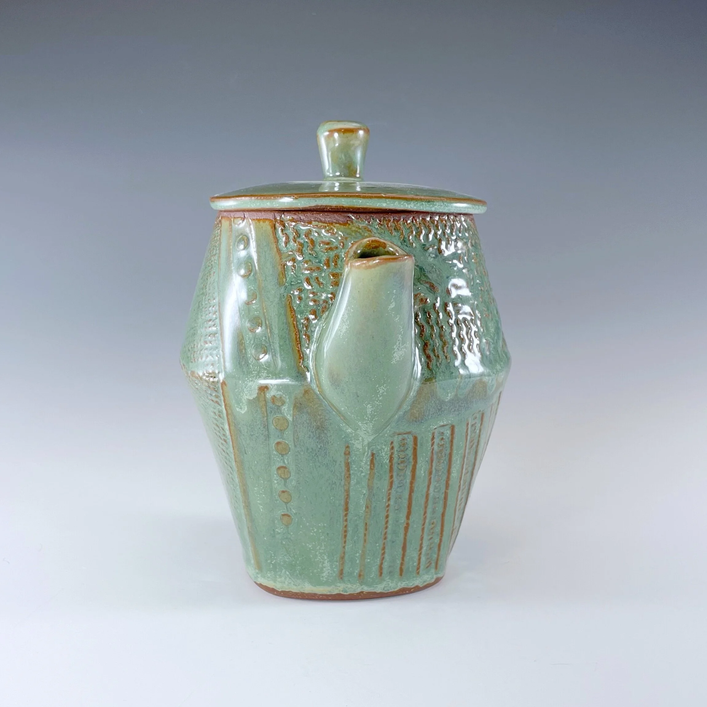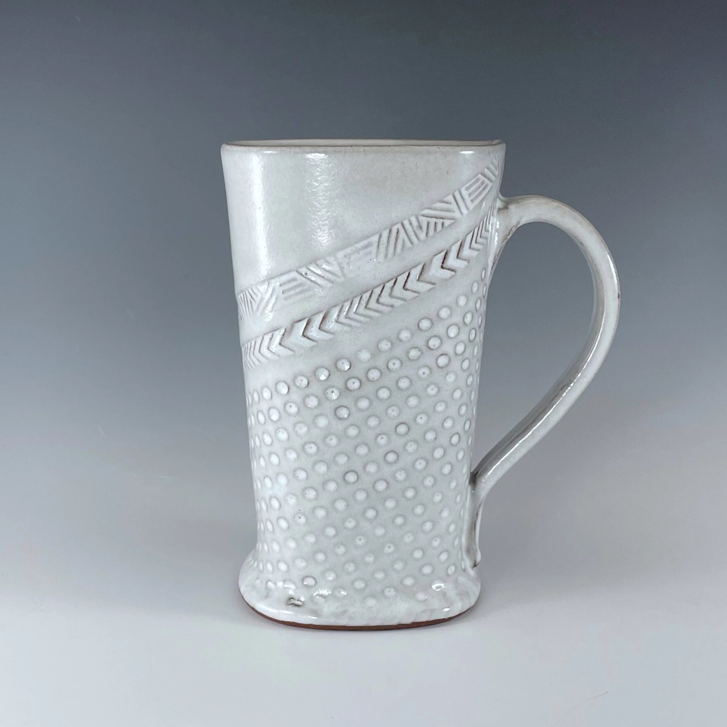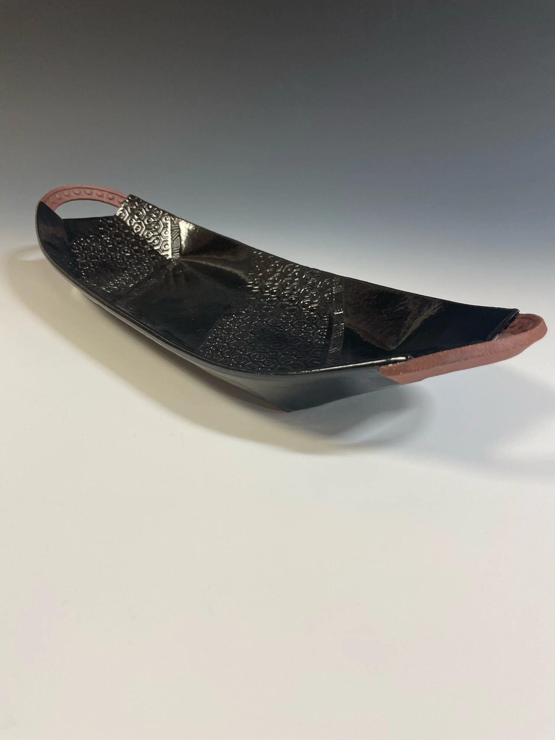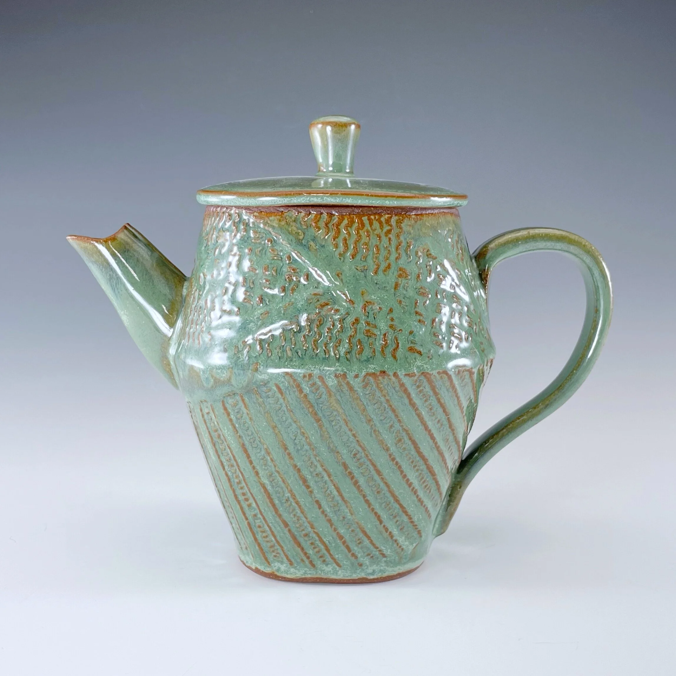 All my work is made from slabs and without a potter’s wheel. Look closely and you will be able to see the place where the seams come together. It is fired twice in an electric kiln, the second firing going up to 2200 degrees Fahrenheit. The clay and glazes are lead-free and food safe. All my work is made for use, not just to be displayed. It is durable, microwaveable, and dishwasher safe.