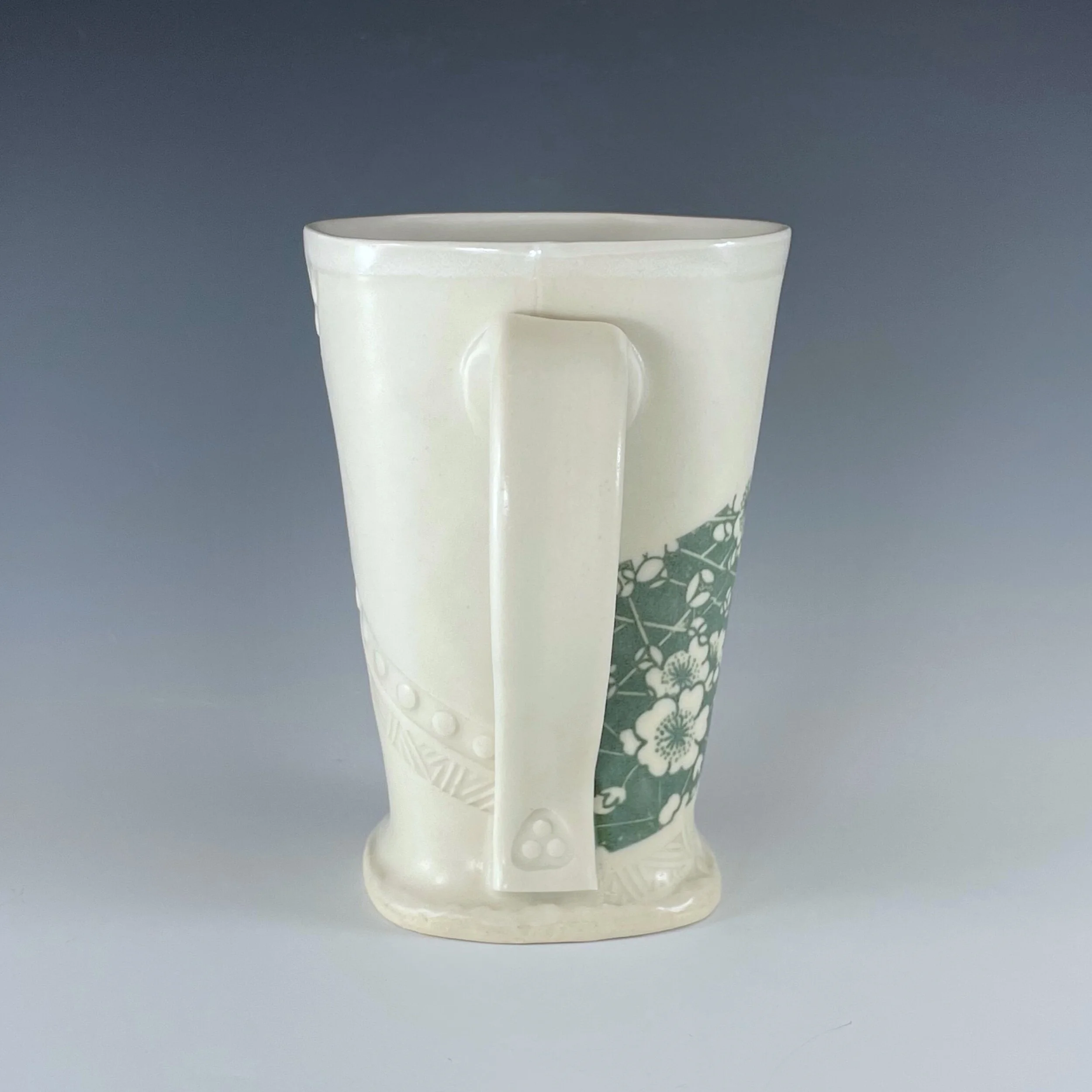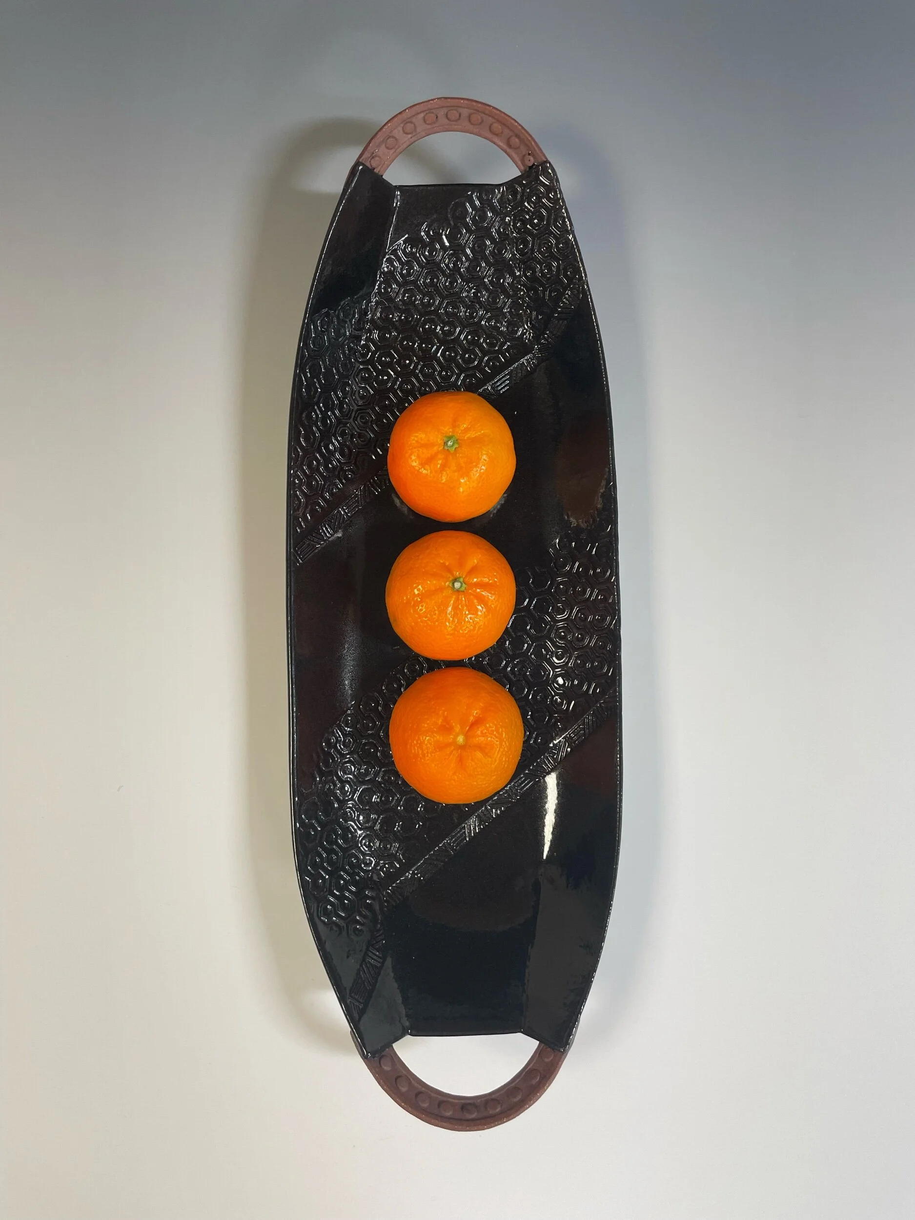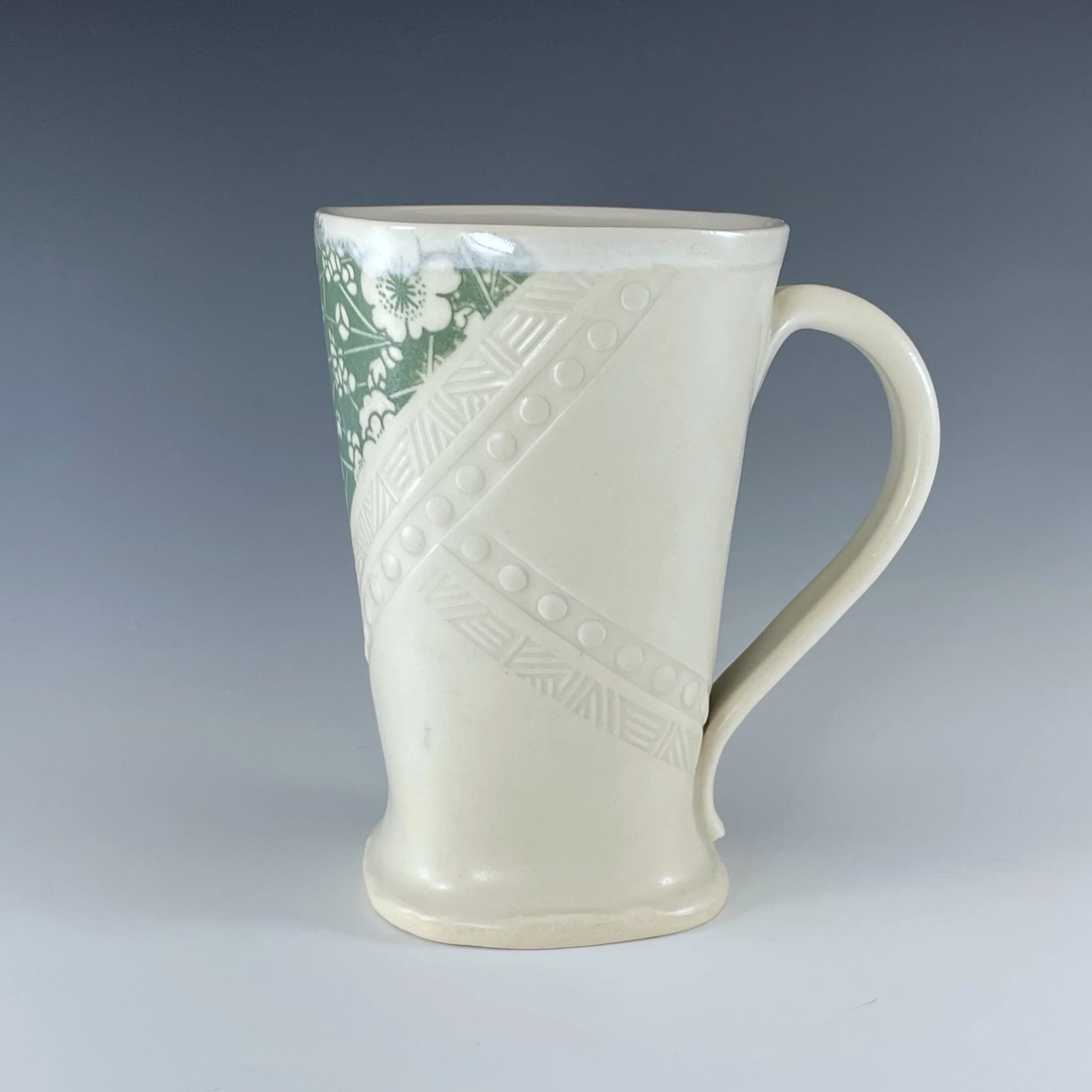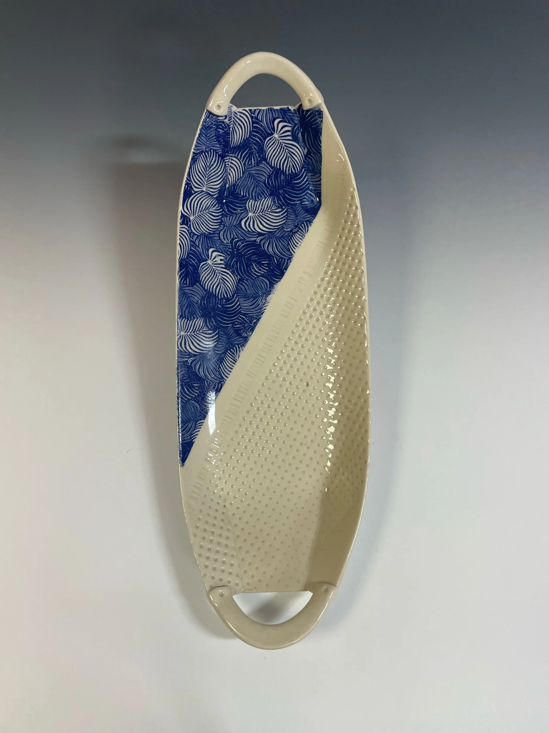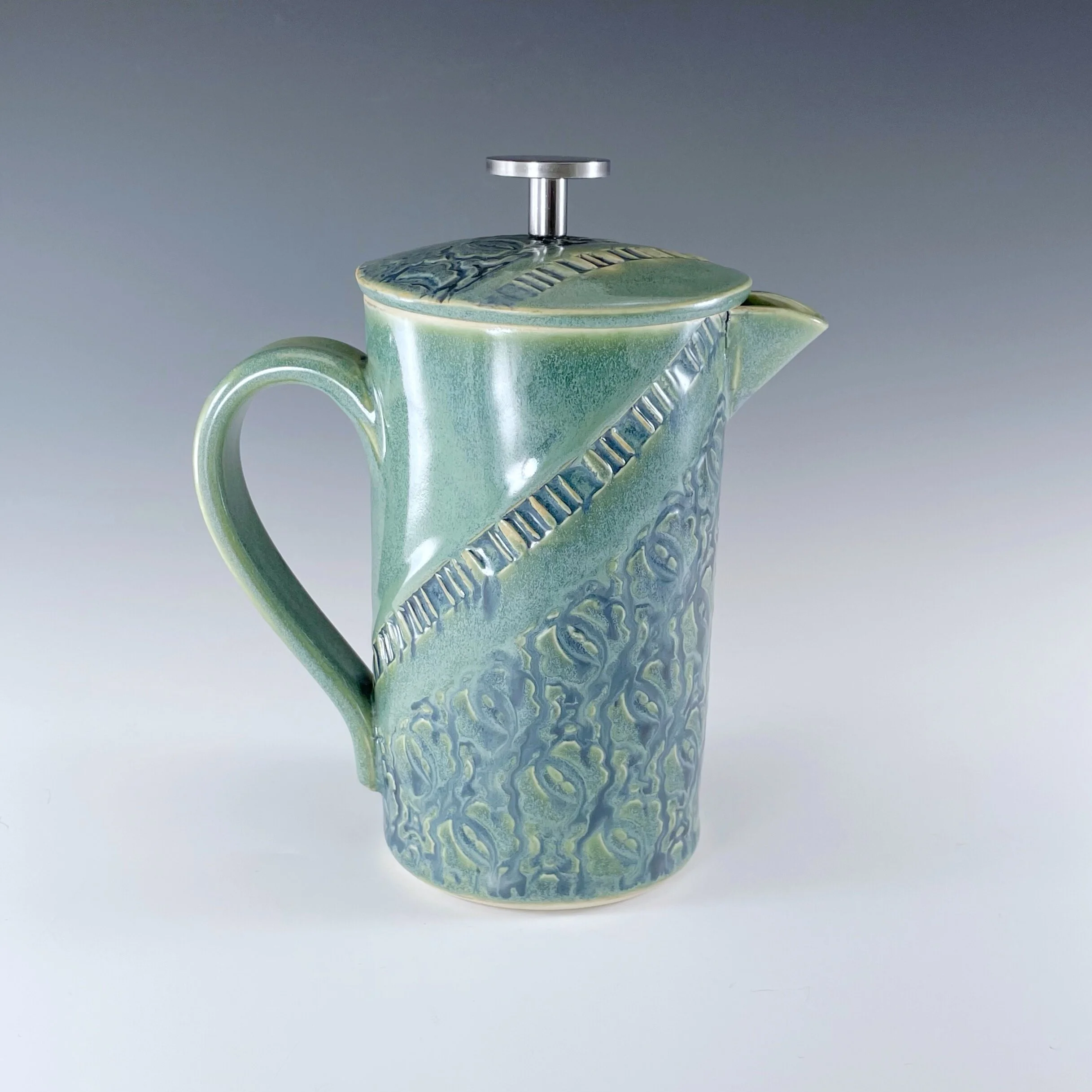 All my work is made from slabs and without a potter’s wheel. Look closely and you will be able to see the place where the seams come together. It is fired twice in an electric kiln, the second firing going up to 2200 degrees Fahrenheit. The clay and glazes are lead-free and food safe. All my work is made for use, not just to be displayed. It is durable, microwaveable, and dishwasher safe.