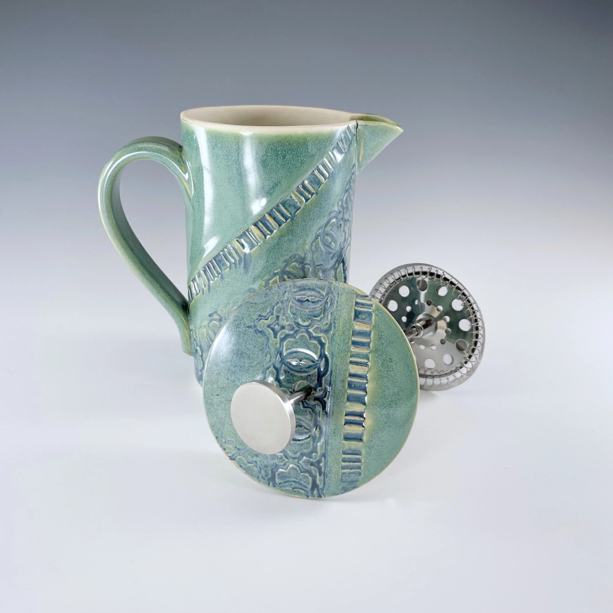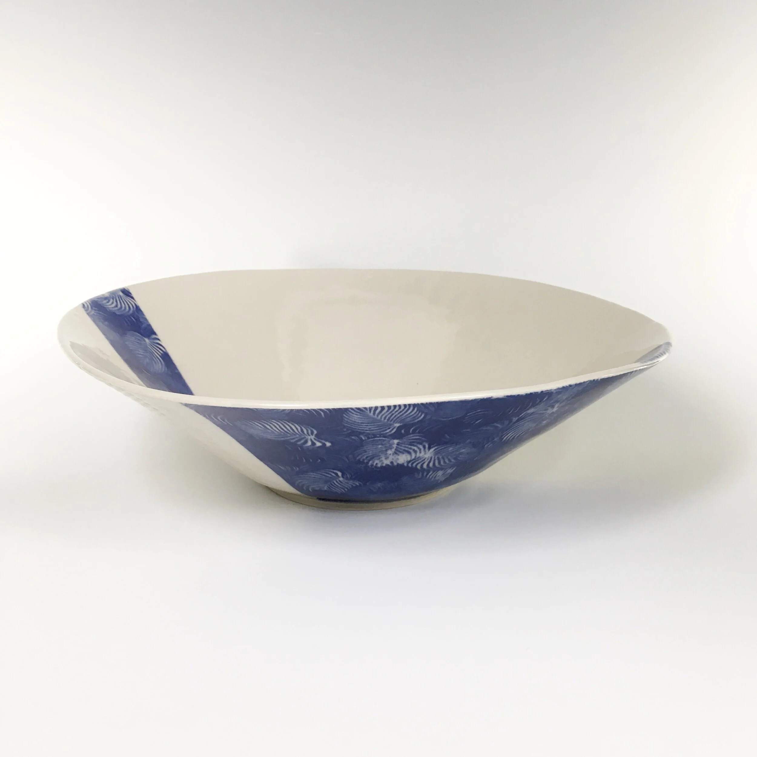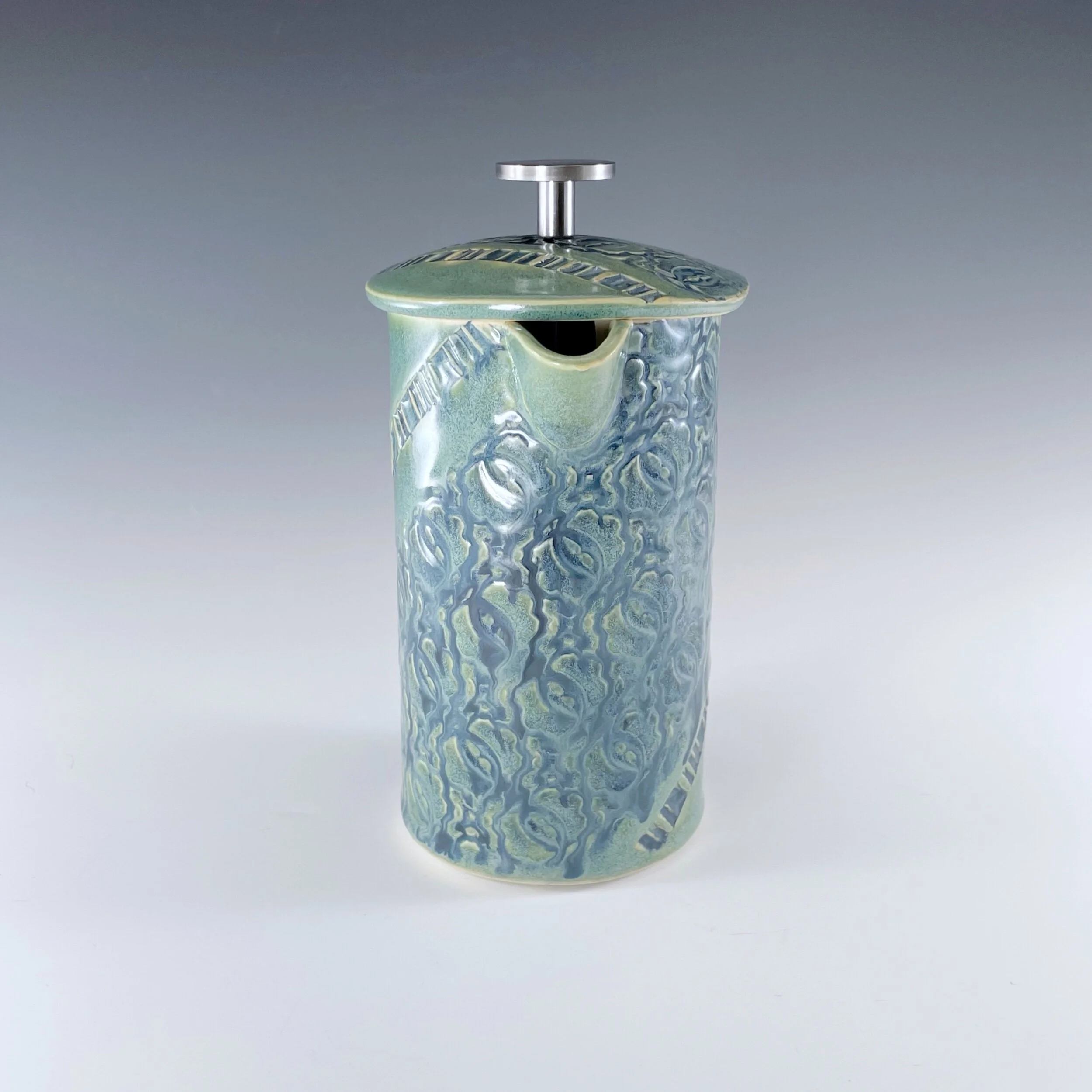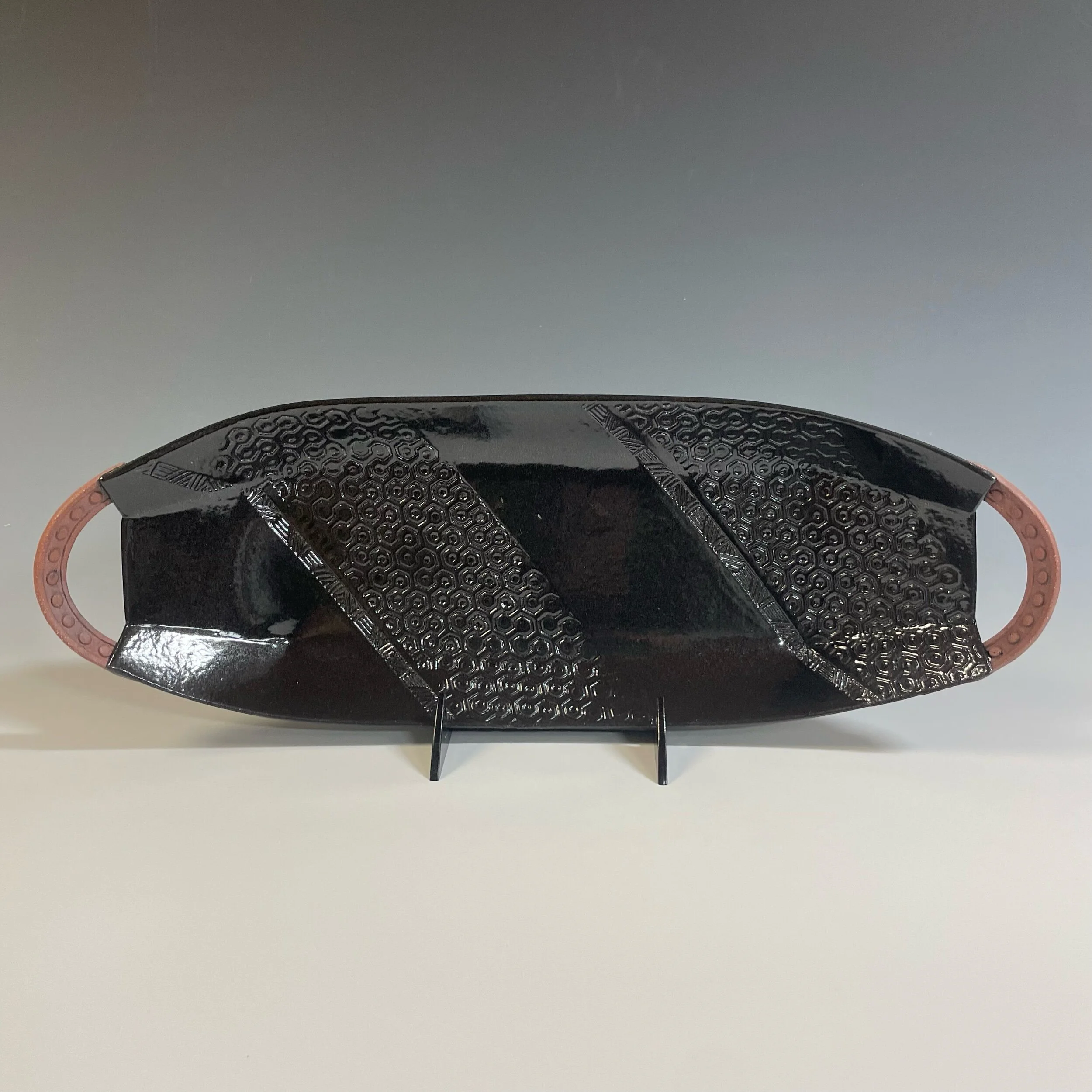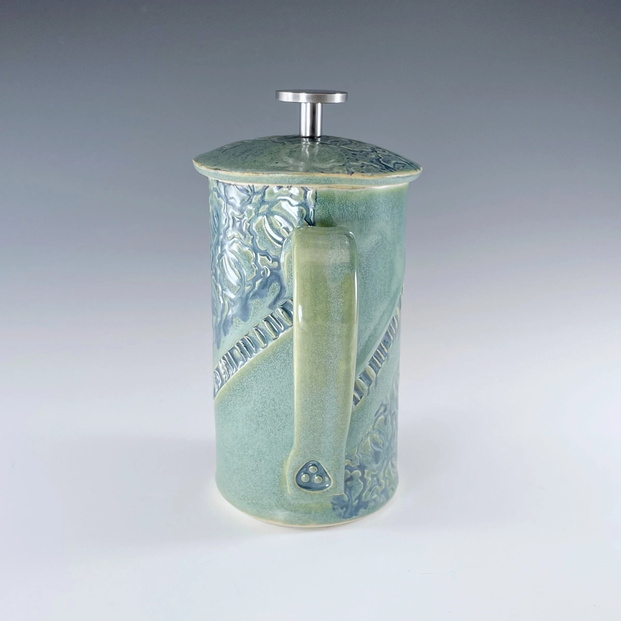 All my work is made from slabs and without a potter’s wheel. Look closely and you will be able to see the place where the seams come together. It is fired twice in an electric kiln, the second firing going up to 2200 degrees Fahrenheit. The clay and glazes are lead-free and food safe. All my work is made for use, not just to be displayed. It is durable, microwaveable, and dishwasher safe.